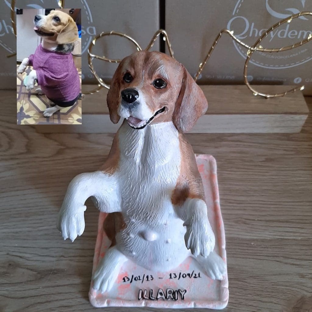 Además, podemos incluir nombre grabado en la base y pequeños accesorios representativos. Todo el proceso se realiza de forma artesanal, garantizando calidad y un resultado único y especial de las esculturas de mascotas.