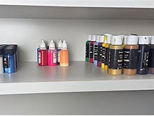 Pinturas acrílicas profesionales combinadas con pinceles de distintos grosores para lograr sombras, luces y textura realista.